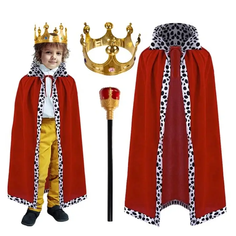 Bērnu karaļa kostīms ar kroni un zizli. Komplektā ir iekļauts skaists auduma karaļa apmetnis (mantija), plastmasas kronis (garums 55 cm) un zizlis. Kronis ir dekorēts ar krāsainiem dārgakmeņiem.