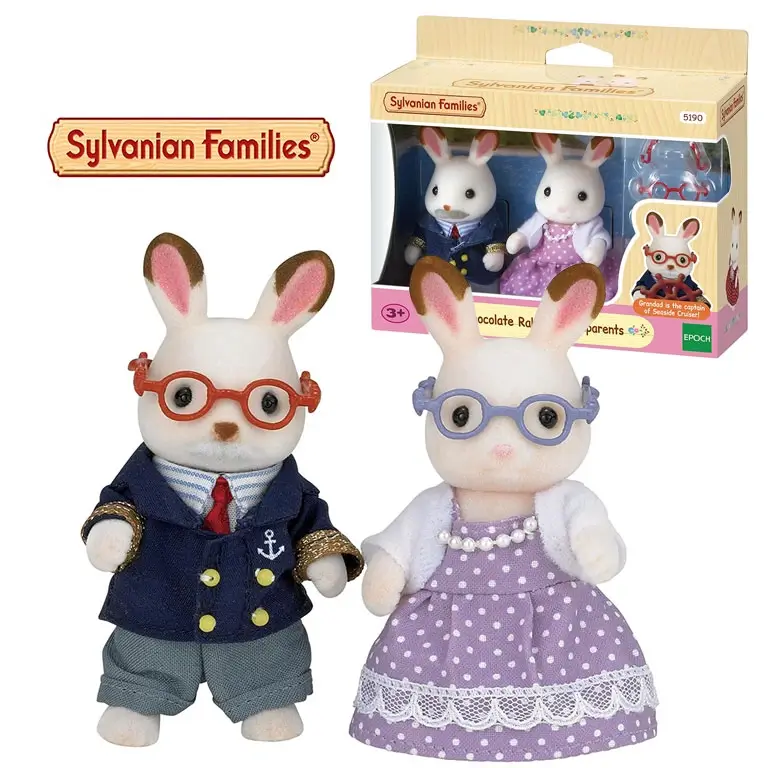 Sylvanian Families rotaļu šokolādes zaķīšu vecvecāku komplekts. Rotaļu komplekts ir piemērots bērniem no 3+ gadu vecuma. Komplektā “Chocolate Rabbit Grandparents” ietilpst divi zaķīši – opis un ome. Papildus komplektā ir divi briļļu pāri.
