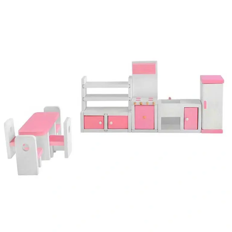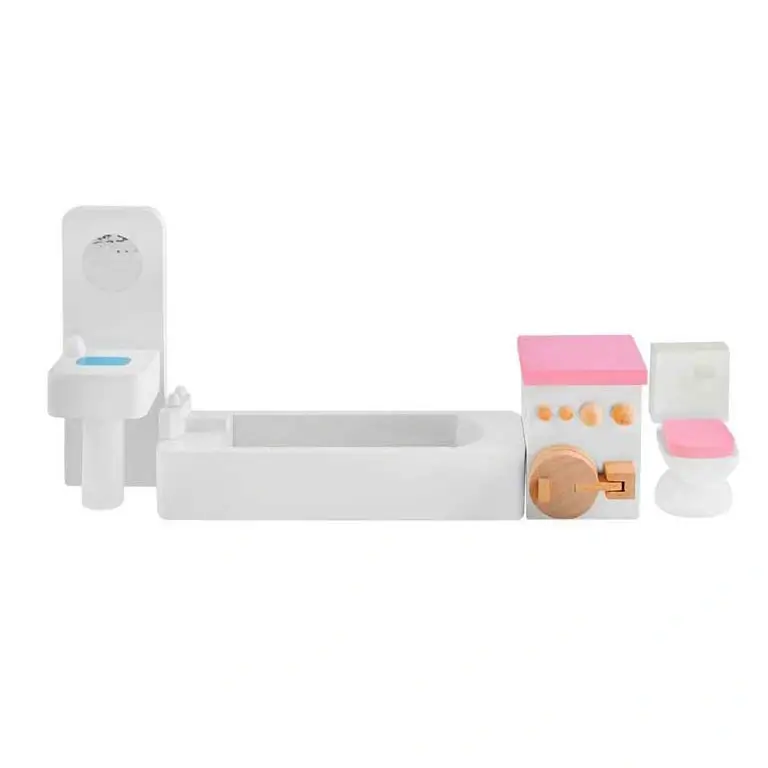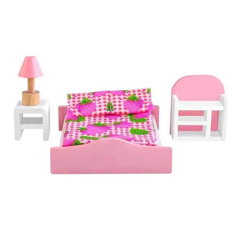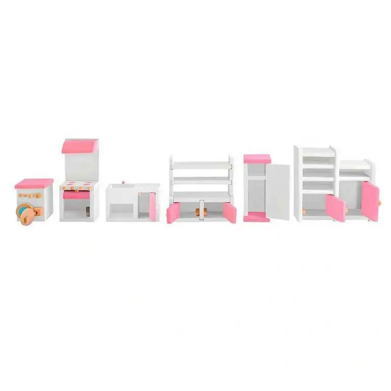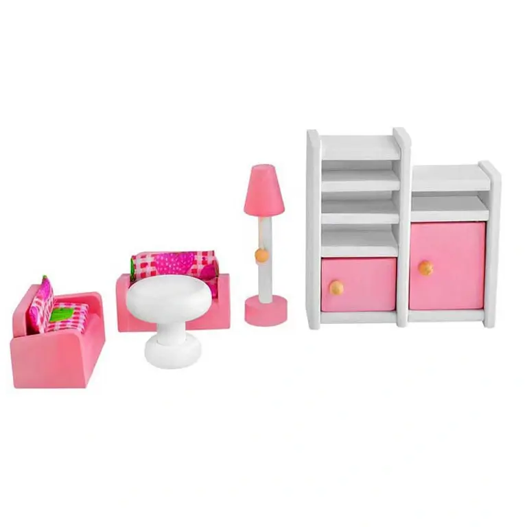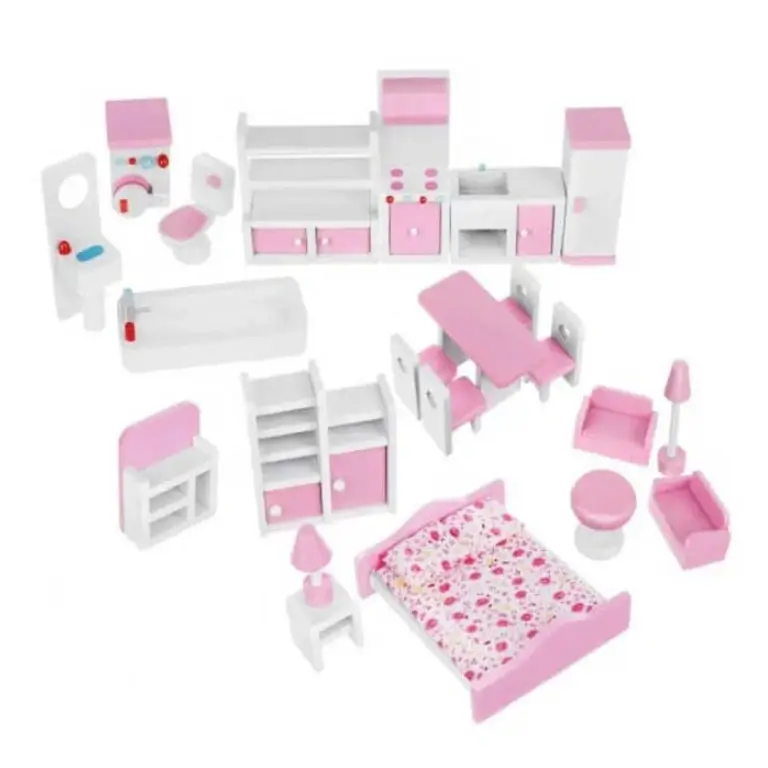 Игрушечная деревянная мебель для обустраивания дома. В наборе 22 элемента. Мебель предусмотрена для гостиной, кухни, спальни и ванной комнаты.