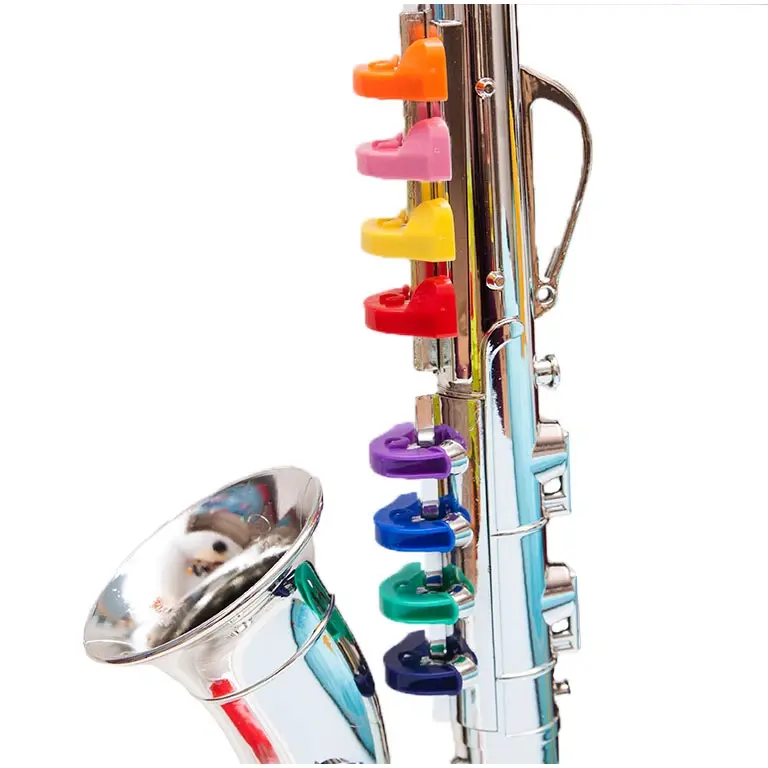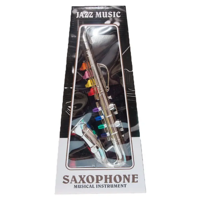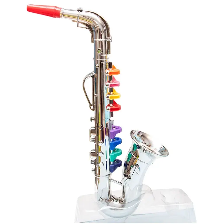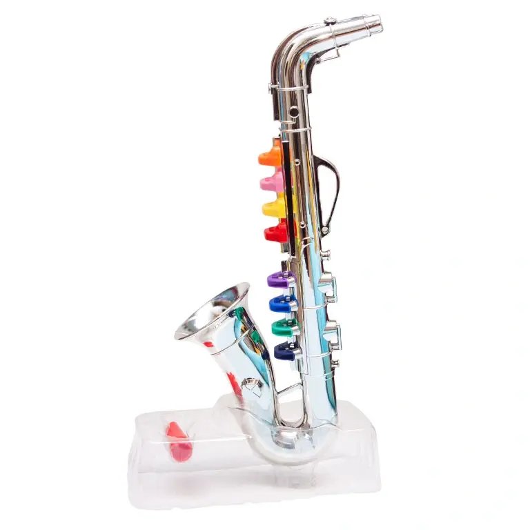 Пластмассовый игрушечный саксофон серебряного цвета. Сложно назвать полноценным музыкальным инструментом, но он способен издавать мелодии и звуки.