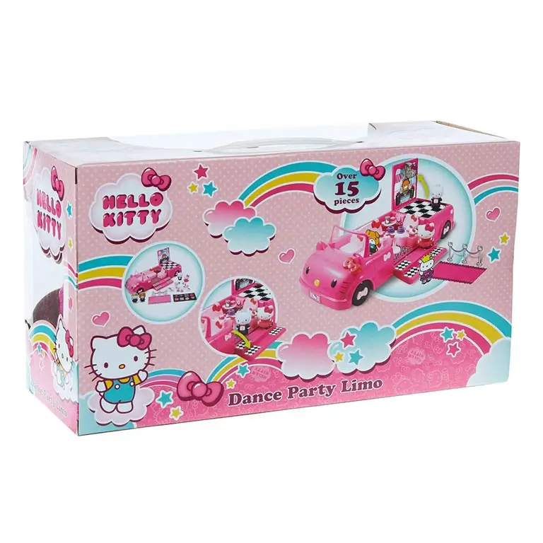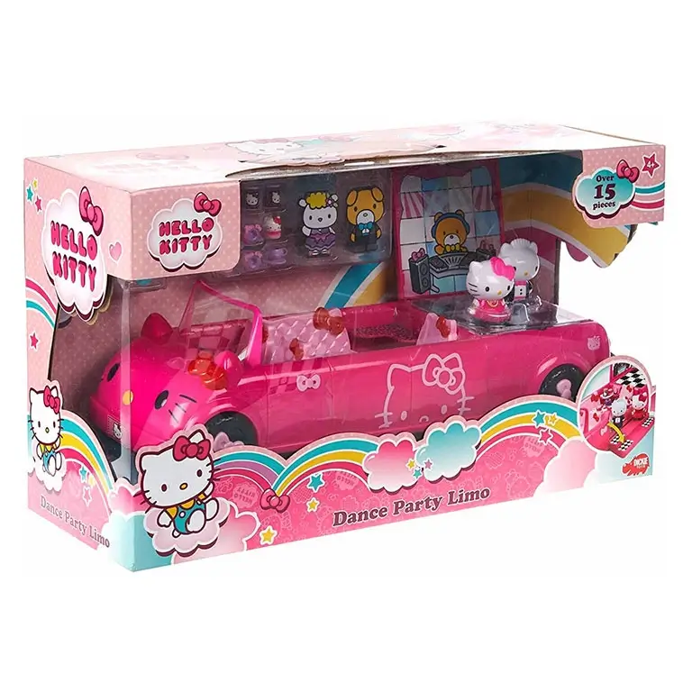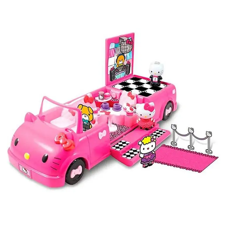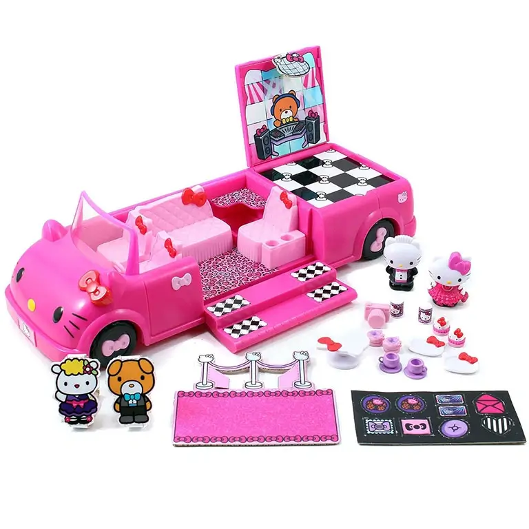 Шикарный розовый лимузин для музыкальных тусовок Hello Kitty. Автомобиль поделен на три игровые зоны — зона танцев, зона ресторан и зона для водителя. К набору прилагаются стильные аксессуары для организации банкета, в том числе столик и посуда.